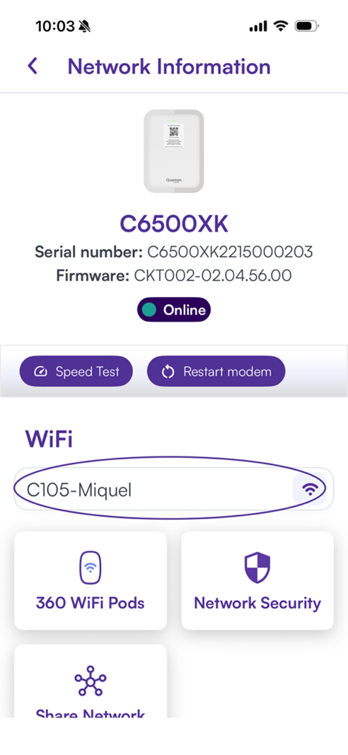 From the main screen, tap Network Information. This section shows information about your network, including your network name (SSID) and password.
