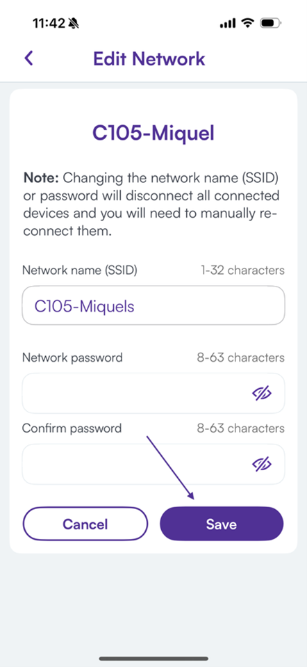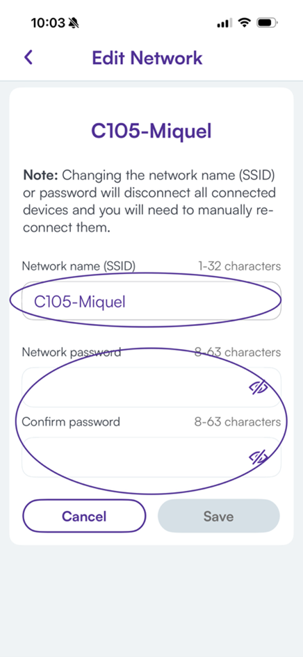 Once entered, tap anywhere on the screen or hit the return button to go back to the previous screen. Your changes will appear in the Network Name (SSID) box but won’t be saved until you hit Save a little later, after updating your password.
