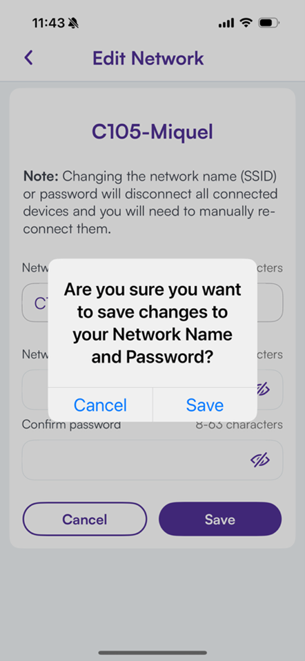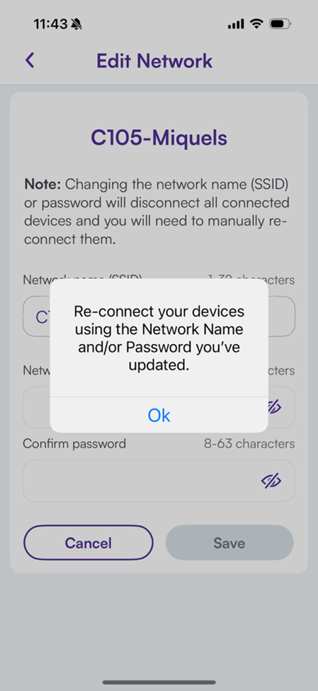 After you’ve entered your new SSID and password, click Save, then confirm on the pop-up window. After your router updates, you’ll be reminded to reconnect your devices, then returned to the Network Information screen.